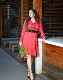 Red Polka Lycra satin Trench coat cut dress with front buttons and detachable belt.