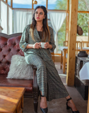 Indigo Geo-floral bamboo cotton coord with a summer jacket and uneven hem pants that have a solid side stripe.