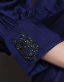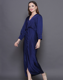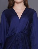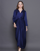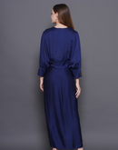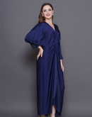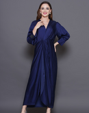 Mid calf length, draped dress, balloon selves, fitted at waist, side zip.