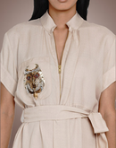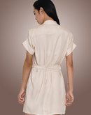 Bamboo cotton shirt dress with zip detail and broad belt with irregular hemline in beige.