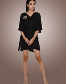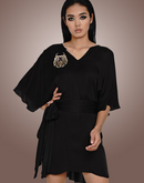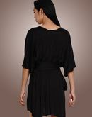 Modal V neck loose short dress with a broad belt in black.