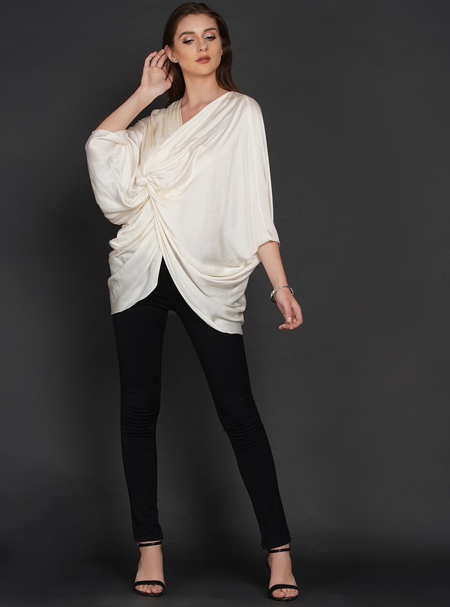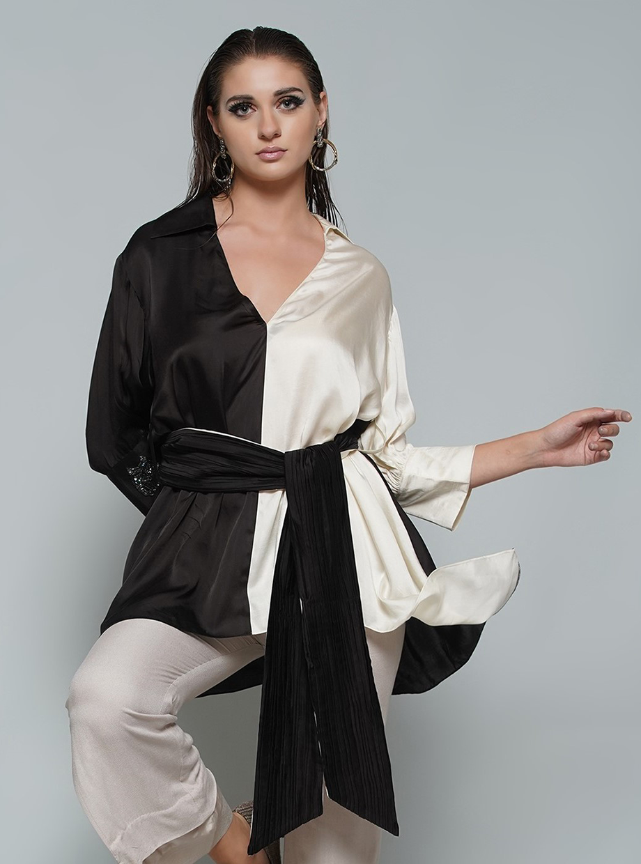 Full sleeves collared top- half white half black, with pleated belt in both colours.