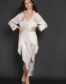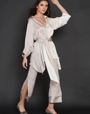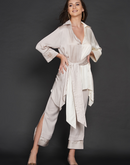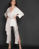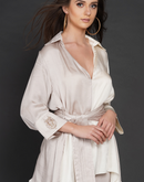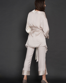 Full sleeves collared top- half white half ivory, with pleated belt in both colours.