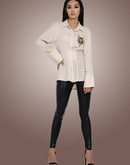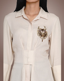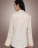Beige bamboo cotton shirt with flap detail in the front and concealed buttons.